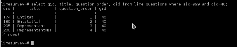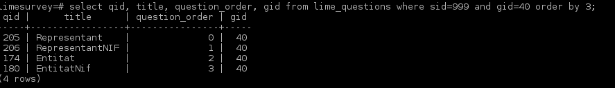 Hi, I upload a survey and 4 screenshots. test01a.png and test-01b.png shows initial position of questions at screen and database I move 4th question [RepresentantNIF] to top of question group and I get test-02a.png and test02-b.png. As you can see, the rows of the table of the database do not correspond with the order wished of the questions. Thank's in advance. |
