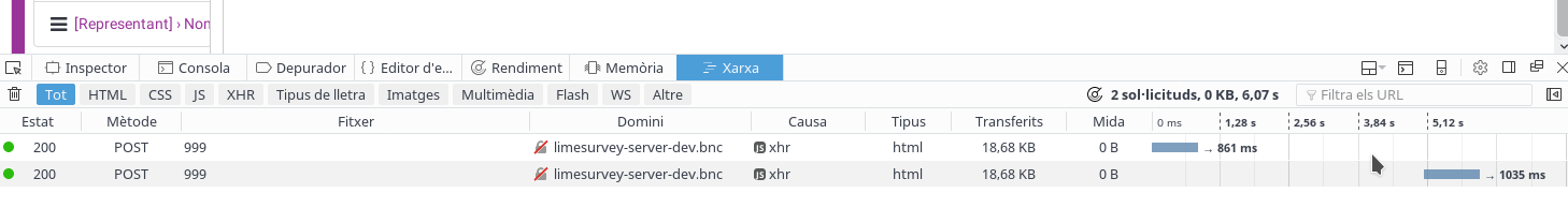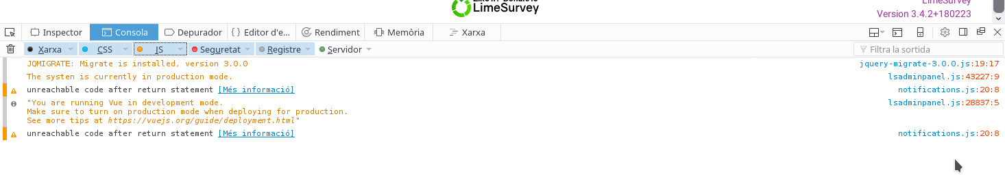 I modify ./application/config/config.php as is: 'config'=>array( It's rigth? I check the network ('Xarxa' in catalan) tab in the browser dev tool (F12). I move questions and I get first screenshot and JS tab shows second screenshot. |