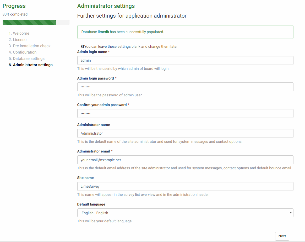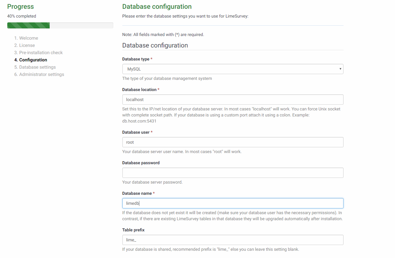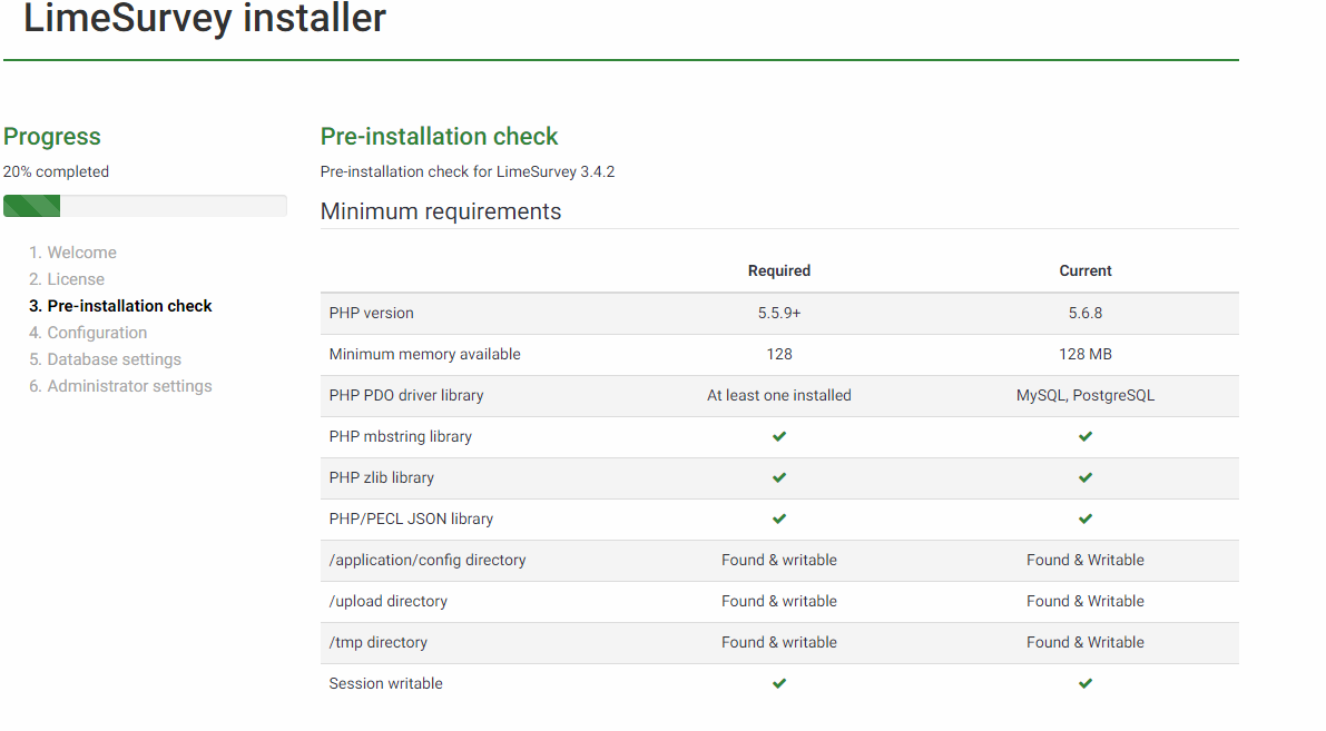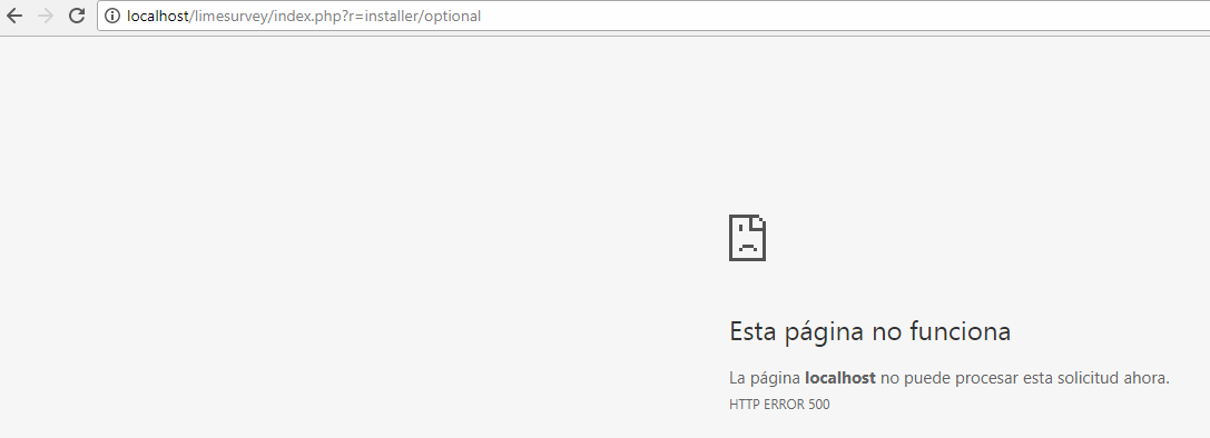 OK, then we need to enable debug information. Since it's during installation, it's a little bit harder. Go to index.php in the web root folder: https://github.com/LimeSurvey/LimeSurvey/blob/master/index.php#L154-L173 All lines need to be removed except: define('YII_DEBUG', true); Then please try again. |