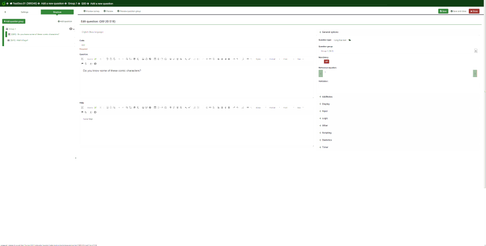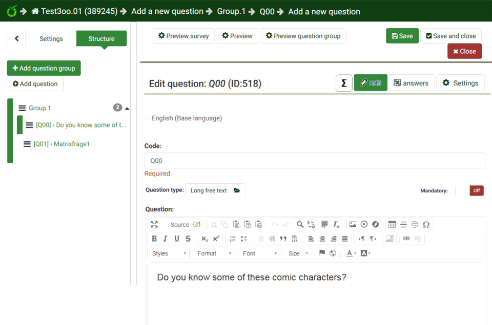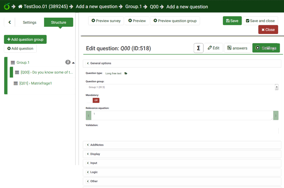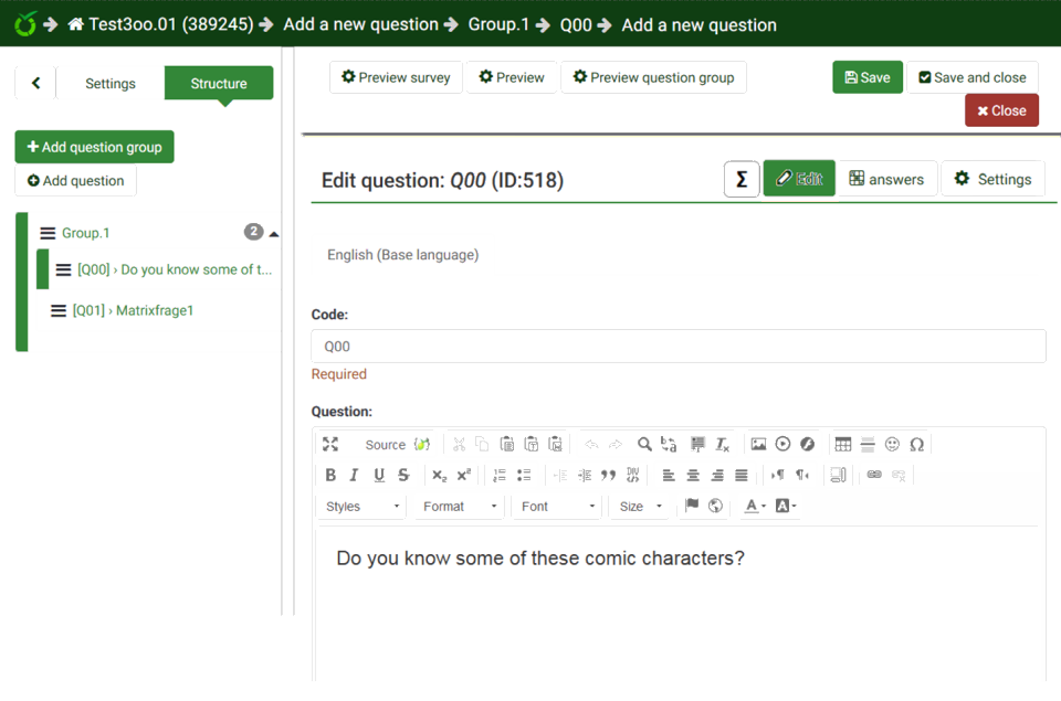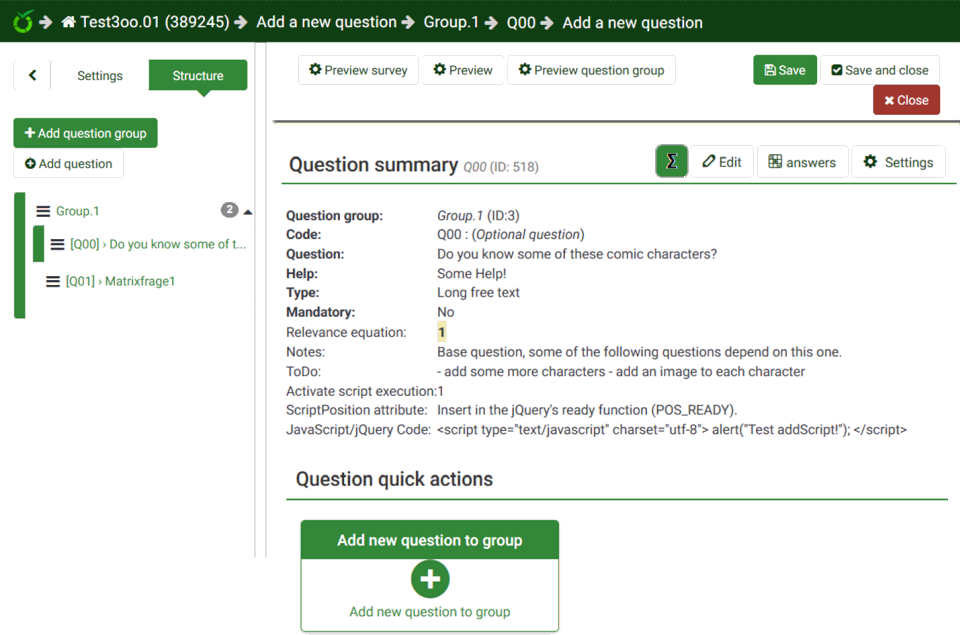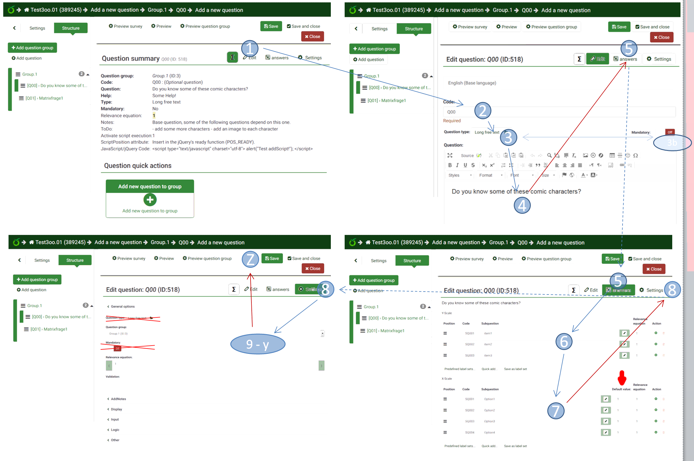 My idea is more something like this : Near same look than Adv settings for : text+code/answers/sub-questions (X and Y separate ?)/ maybe condition I think it best if we have one button for edit where we can edit ALL question related part. PS : i think Question summary must show Sub question + Answer since a lot of time (but never found time to add this feature ;) ) |