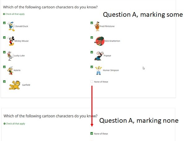| Description | If in a multiple question an exclusive option is set and choosen at runtime, then all other options are vanishing. That's contraintuitive and I think it would be much more usable to make the non exclusive option unchecked and non-selectable (or grayed). | ||||