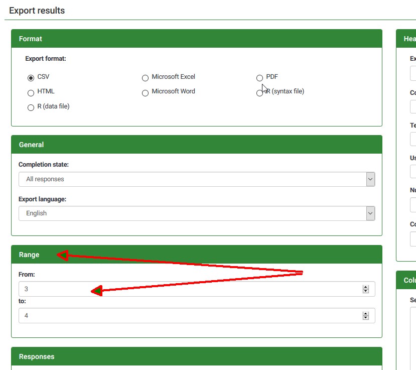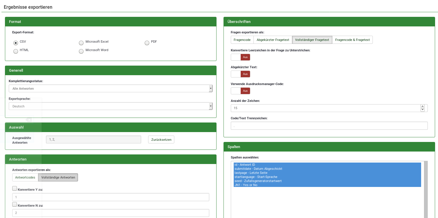 | Steps To Reproduce | Wenn man die Antworten eine Umfrage exportieren möchte (Simple (359138) Ergebnisse exportieren) kommt bei jeder Umfrage, auch wenn diese ganz einfach ist und nur aus einer Ja/Nein-Frage besteht der o.g. Fehler. Die sonstigen Exporteinstellungen scheinen auch egal zu sein (habe mehrere ausprobiert), die gewählten siehe Bild im Anhang. | ||||