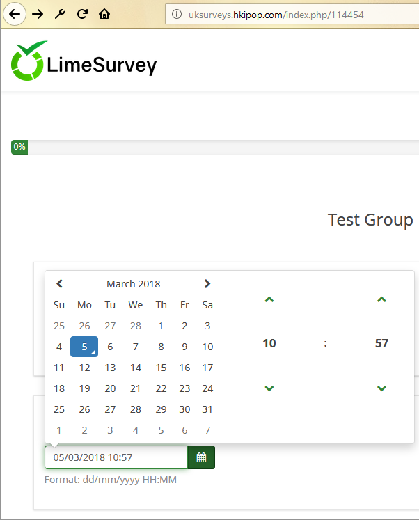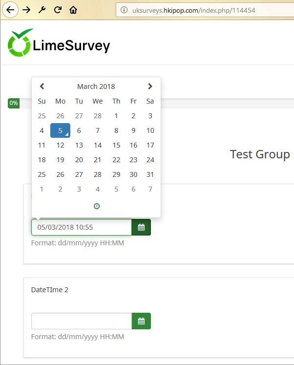 | Description | There is a two-part bug in the DateTimePicker. I have created http://uksurveys.hkipop.com/index.php/114454?newtest=Y&lang=en to demonstrate; this survey consists solely of two identical DateTimePickers. Bug A: The two DateTimePickers were created identically, but when you click the Calendar button for them on the survey they look different. The first one shows a calendar with a small clock icon underneath; the second one shows a calendar side-by-side with a large, adjustable digital clock. Two questions created the same way should behave consistently. Bug B: It's not obvious that the small clock icon under the first calendar is in fact a button that leads to the other half of the DateTimePicker. I spent nearly a month working sporadically on bug 13322 before I realized the first DateTimePicker had another side. If you're going to hide half of the DateTimePicker interface behind a button, it must be obvious that it is a button, and the button should be clearly labeled. | ||||