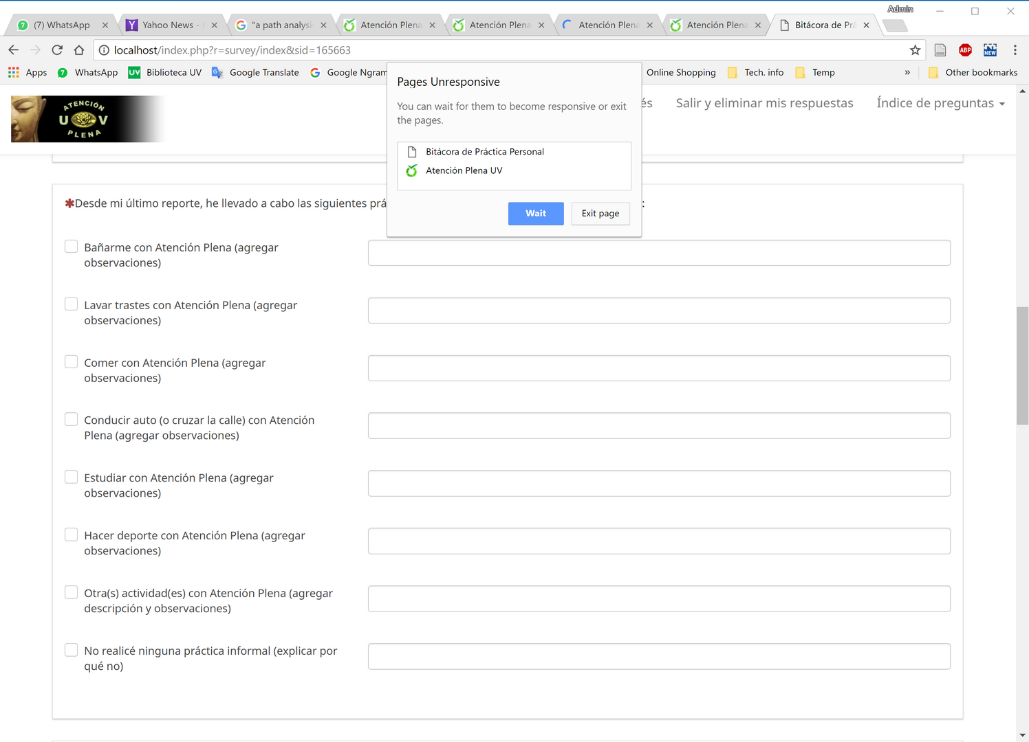 | Description | When a respondent selects the "exclusive" checkbox in a "Multiple-choice with comments" type question, the browser page hangs (see attached screenshot -- the faulty checkbox is the last one on the list). I have verified that this issue exists in the latest release, v3.5.1+180312. This did NOT happen on the previous version I was using, v2.71. I have found a workaround for now: removing the exclusive option definition gets the survey working again, albeit with a somewhat faulty logic (the respondents can now select a positive response and a "none" option at the same time). | ||||