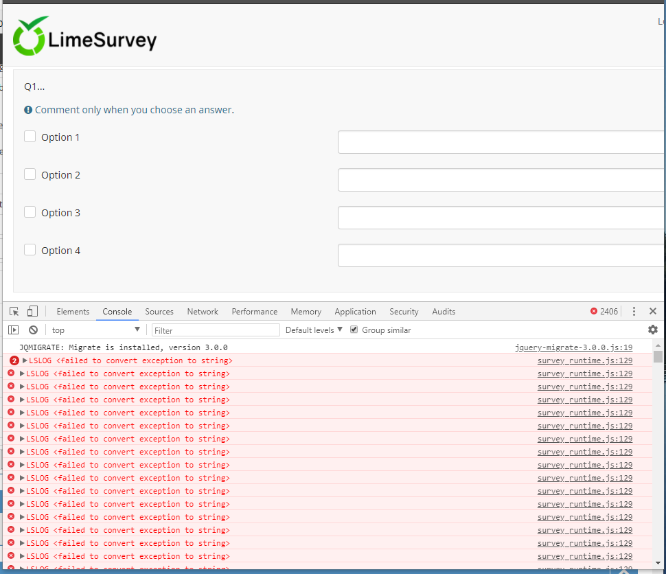 I can confirm - fatal JS error (loop) - survey_runtime.js, line 129. |