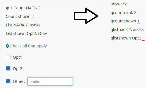 | Additional Information | Also {list(that.QNAME.shown)} in JS show "Other" for Other answers and {list(that.QNAME.NAOK)} show other answer itself. Is it possible to show answer itself in {list(that.QNAME.shown)} too? | ||||