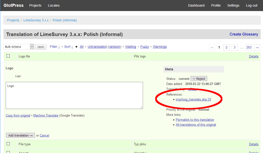 | Description | The link to the translated phrase reference does not work. The link is red-outlined in the attached picture. This applies to the screen for translators, e.g. https://translate.limesurvey.org/projects/limesurvey-3/pl/default/ | ||||
