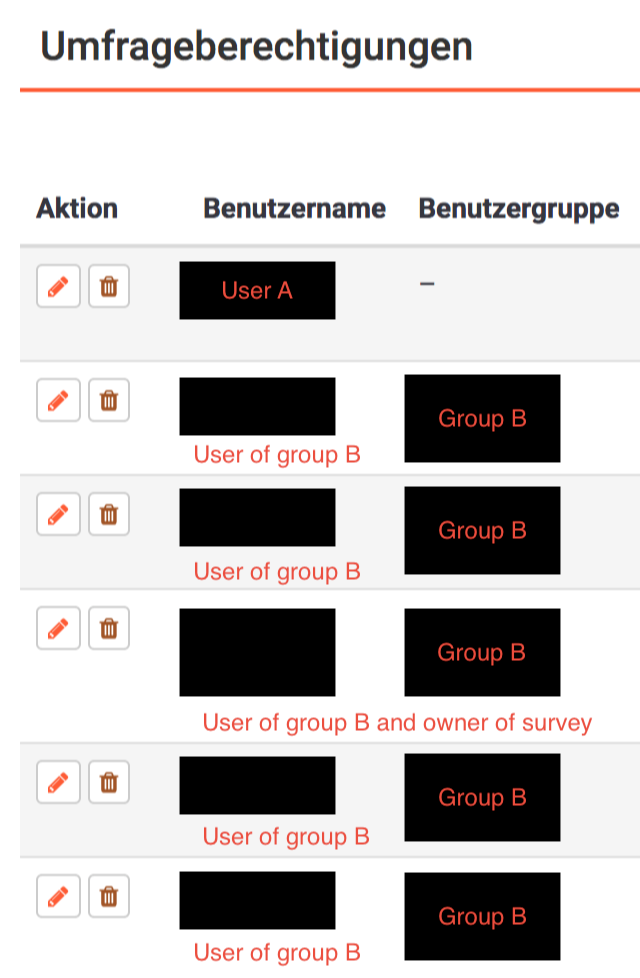 | Description | If a superadmin adds permission to a user A and permissions to users of a group B, user A does not see the other users in survey permissions overview and the other way round. A is the only one who is NOT member of the group B. Users of the group (including the owner of the survey) only see the other group users but not user A. Please ask for more screenshots if it's unclear. I think, the survey owner should always see who can access his survey (maybe excluding the superusers). | ||||