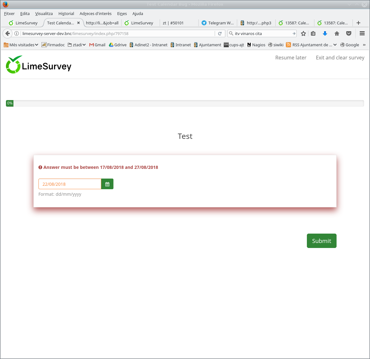 | Description | When user selects a valid date from calendar plugin and question have minimum and maximun date, error message "Answer must be between 17/08/2018 and 27/08/2018" is always showed. Otherwise, survey can be submited. Thank's in advance for your good work. | ||||