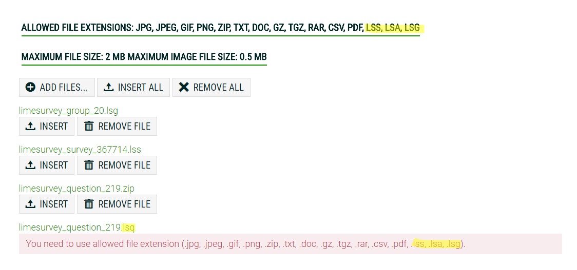| Description | When trying to upload a .lsq file the forum software did not allow it. Needed to zip the file to be able to upload (https://www.limesurvey.org/forum/design-issues/115250-array-question-is-not-working-on-limesurvey-3-7-2). .LSA, .LSG, and .LSS all work, but not .LSQ. See screenshot. I think all Limesurvey files should be possible to upload in the forum. | ||||