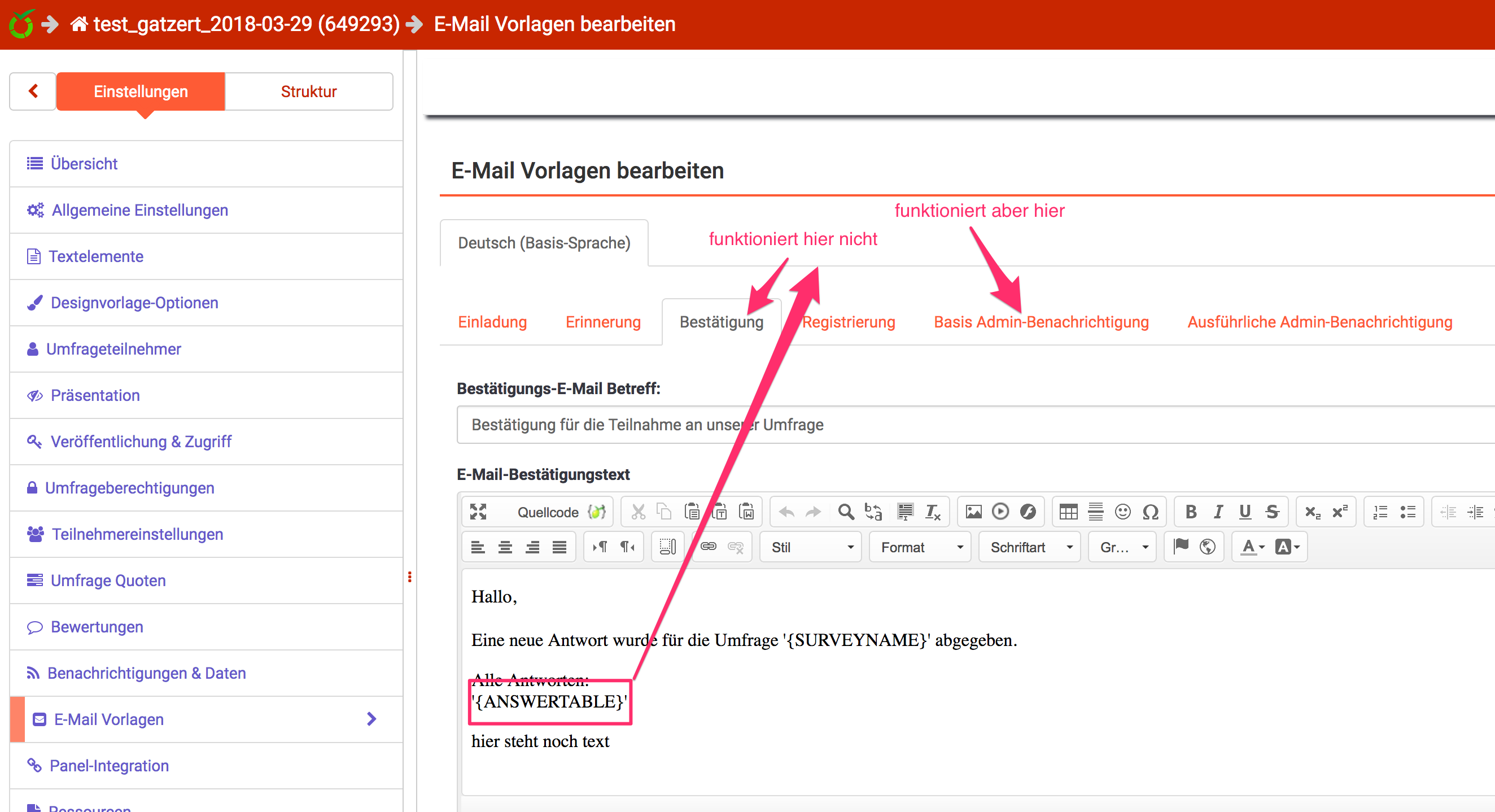 | Description | Die Variable ANSWERTABLE funktioniert nicht in der E-Mail-Vorlage "Bestätigung" - nur in den beiden Admin-Bestätigungen (Basis... und Ausführliche...) wenn registrierte Teilnehmer Zugang zur Umfrage haben. | ||||