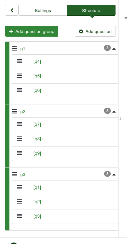 | Description | Hi, Currently the ordering of question groups and questions in the survey list (question explorer) and the final survey itself is wrong. regards, | ||||