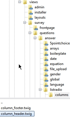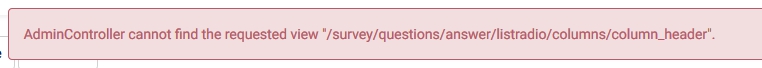 | duplicate of | 13680 | closed | Question screen = AdminController cannot find the requested view "/survey/questions/answer/listradio/columns/column_header". |