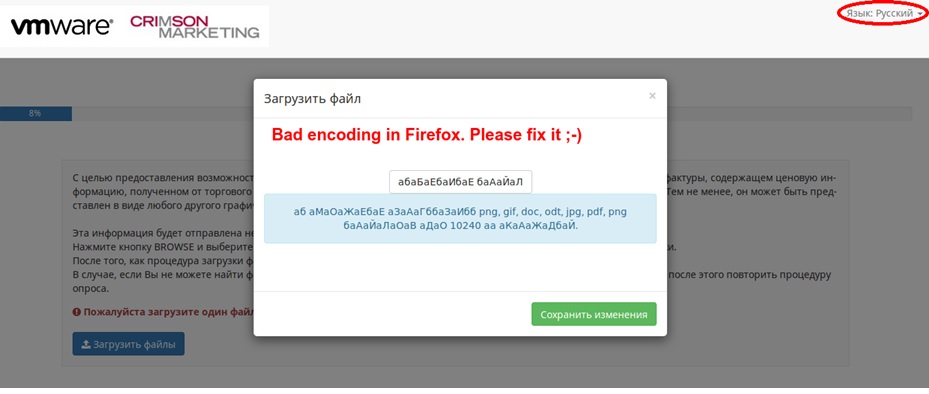 | Description | Had ONE report of this from someone in Russia taking our survey on Firefox. I cannot reproduce it here. Sorry I don't have more information to help. | ||||