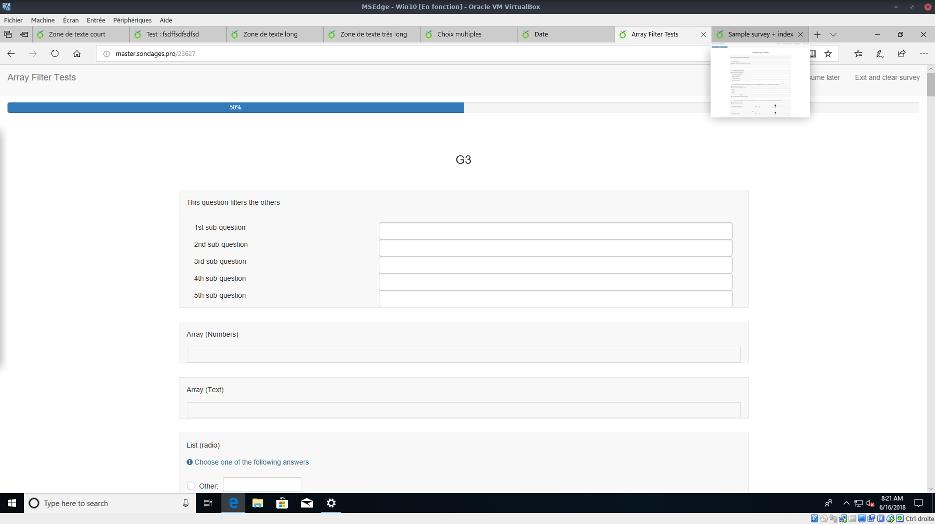 And if it don't work : try to disable ajax in the survey template option :) See this issue with Yii2 and pjax : https://www.yiiframework.com/forum/index.php/topic/69079-pjax-with-ie11-and-edge/ |