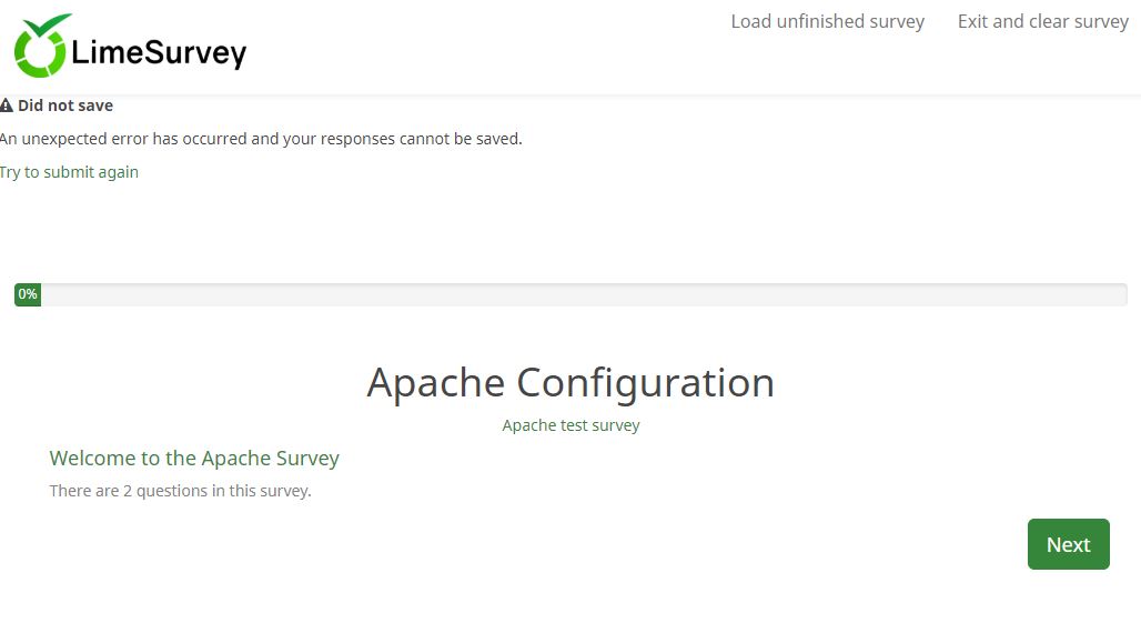 | Description | I have installed LimeSurvey version 3.7.2. After installation I create a survey. The survey is built and has a link that I may use to access the survey. On the initial survey load, under the LimeSurvey logo displays, which is not shown in the HTML save of the web page: I immediately check the database and a row has been added with “id”, “starlanguage” and “seed” populated. The fields “token”, “submitdate”, “lastpage” and question answer column have “NULL”. Based on this information, I select “Next” to see what the results are. It displays the survey but it still has the same “Did not save” message below the logo. I complete the survey, simple “yes”, “no” radial button single question and select “submit”. The completion page is displayed with the “Did not save” message below the logo. I check the database and there are three rows in the database, one for each page, with “id”, “starlanguage” and “seed” populated and “token”, “submitdate”, “lastpage” and question answer column have “NULL”. Main configuration: Alternate configuration: I have done extensive searches and it appears many people are having this issue. Please provide a fix or workaround. Thank you. | ||||