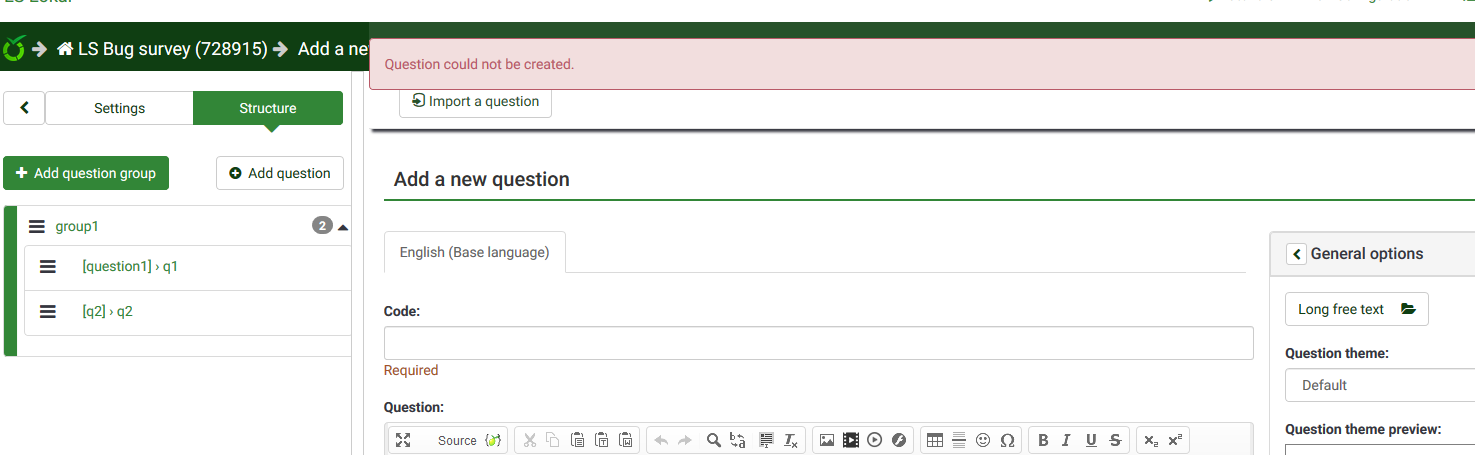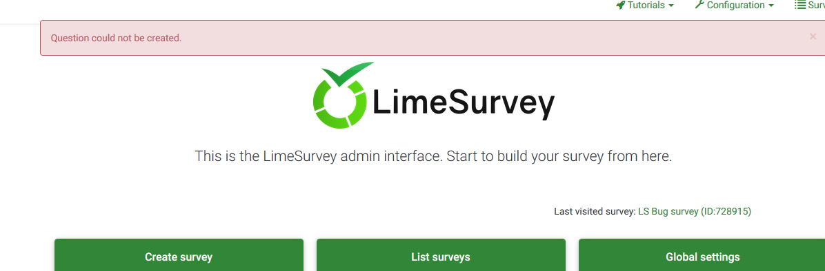 | Steps To Reproduce | Create new Survey: fine If you go back to the landing page then, you will see the red "Question could not be created" message but looking into the survey shows, that the question was created. If I try it now with save and new, I will see the same "Question could not be created" message but the question is displayed in the structure view on the left side. | ||||