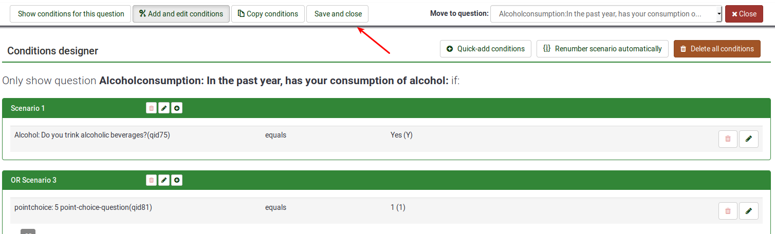 | Description | Check the screenshot. I am not sure what is the purpose of the Save and Close button. Once clicked, it closes the conditions panel , redirecting you to the available question groups page. Please note that there is also another Close button located in the top-right part of the panel. Maybe it can be deleted? Or... maybe there was another option in the past? | ||||
