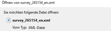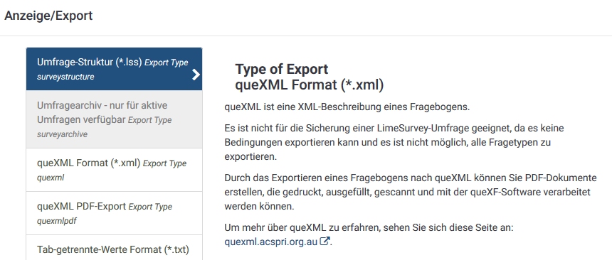 | Description | If I try to export a survey (*.lss) with backend language "German" the first - upper - button (to select the format) doesn't work. If I select a different format (e.g. .xml) the description is shown and the export is done. In English everything is fine. | ||||