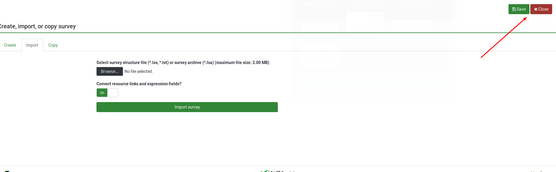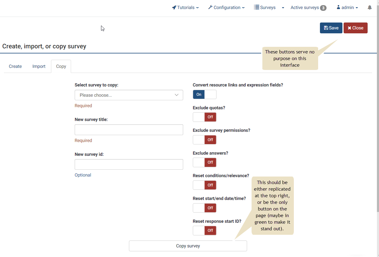 | Description | The Save button serves no function on the Create, Import, Copy page when the tab Import or Copy is selected. Clicking on in these two tabs results in nothing happening (basically the same as clicking Close), and is a bit confusing -- since a user expects that the survey has been copied or imported, but cannot be found (because of course, it isn't there!). I recommend a button be replaced with either [Import] or [Copy] depending on the tab selected, or perhaps since it is outside of the tab views, it is moved to within the sub-tab (see attached screen shot). | ||||