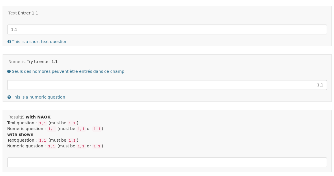 | Description | When entering 1.1 in a short text question : if show the value inside same page : 1,1. In another page 1.1 (in french and other , for separator) | ||||
