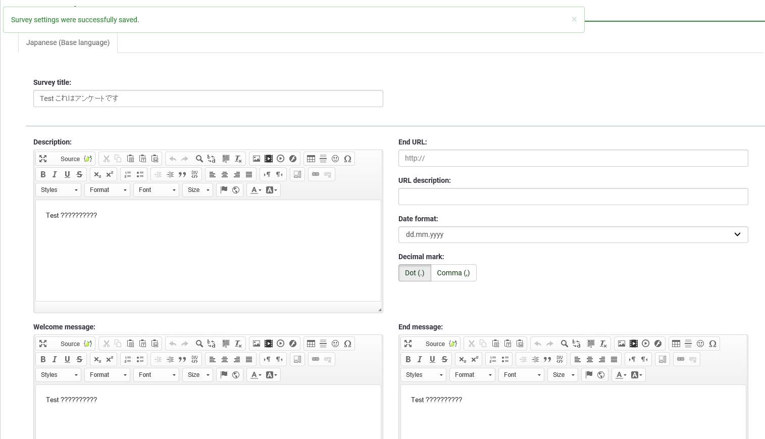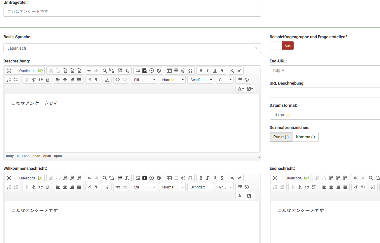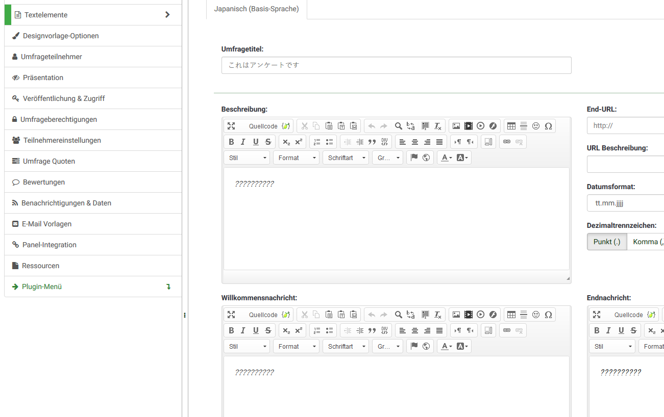 | Description | Settings -> Text elements (Welcome message, Description, End, Privacy...) If I enter a japanese text here, it will be replaced with a lot of questionmarks. This happens only in the editor windows on this page. Everything is fine e.g. when creating questions. | ||||