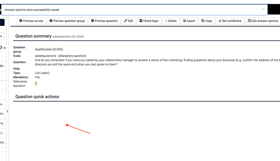 | Steps To Reproduce | Create a survey, Group and Question. | ||||