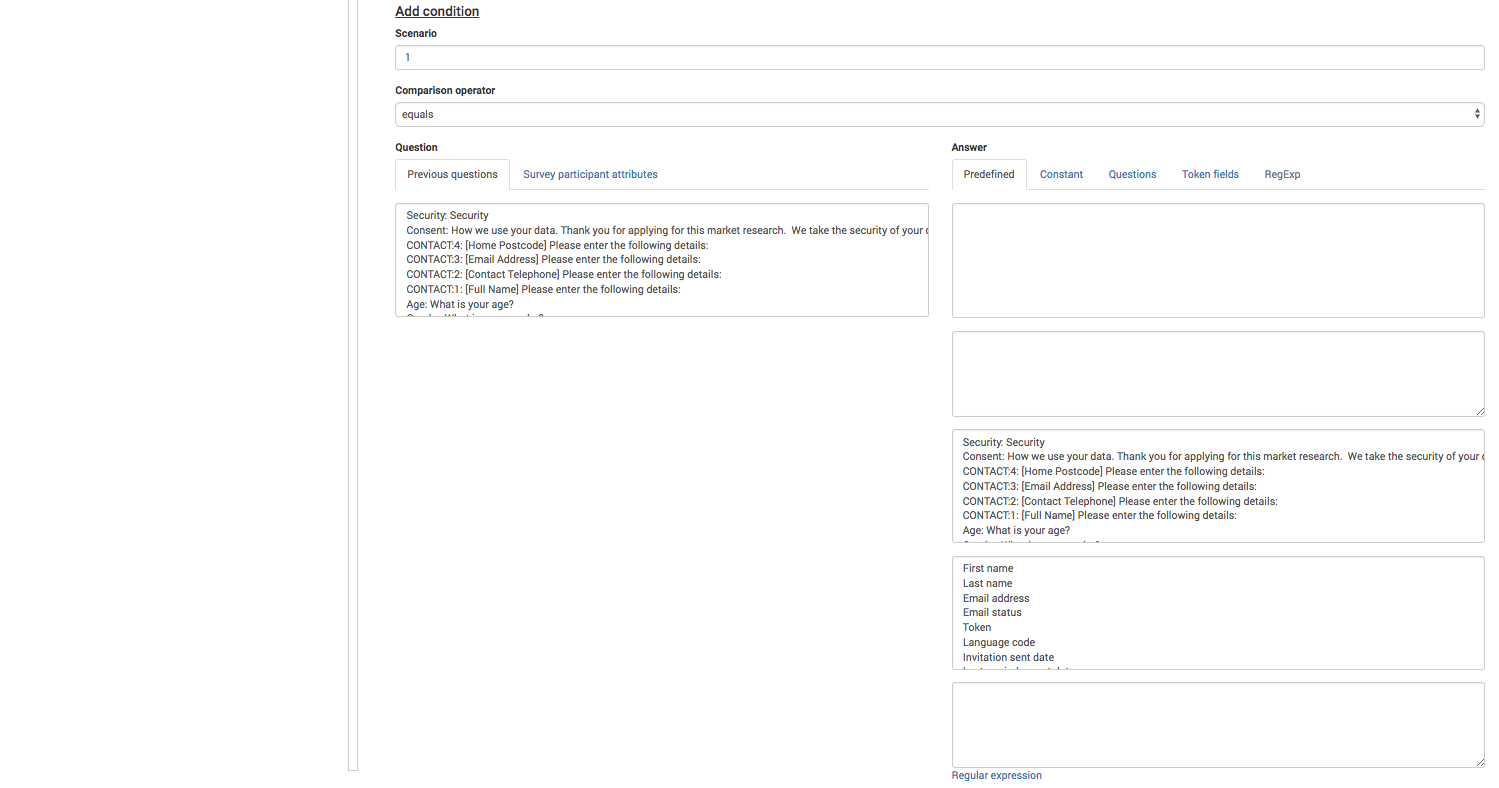 Marc, did you update recently? In this case make sure you clear your cache. After an update I noticed answer items not showing up at the condition editor after having selected a question but that was fixed after having cleared the cache. |