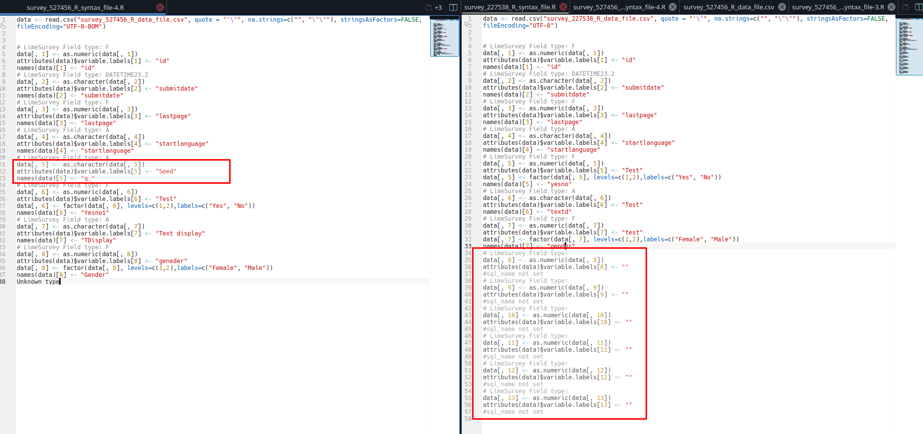 thank you @icecliber81 for your confirmation. Did some tests. The "Unknown type" error appears when save timings is enabled. The timings can be imported in R in LimeSurvey 2.73. But not LS 3.15.8. . In LS 3.15, the data gets exported in the data file, but the syntax file cannot read the timings since there is no command for such a thing (hence, the error type). I have also attached my .lsa files for LS 2.73 and LS 3.15. Extra: saw that "seed" is now being imported in LS 3.15.8 while seed was not imported in 2.73 (see screenshot) |