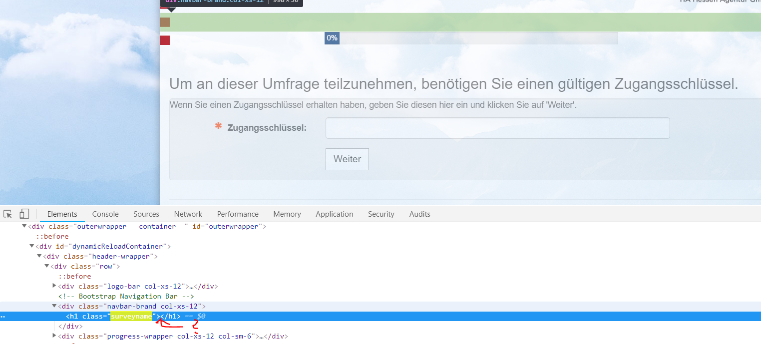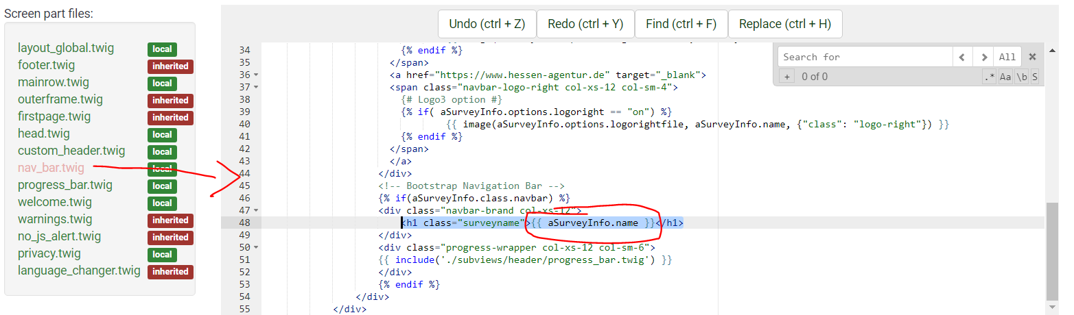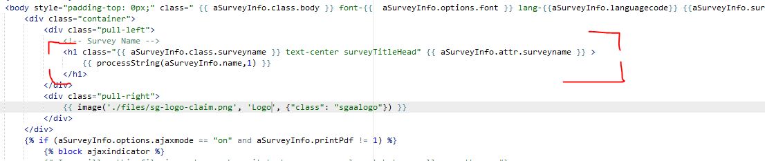 | Description | I am creating my own template with the new twig template engine. <!-- Survey Name --> (I've copied this tiny piece of code from the welcome.twig file (line 27-30).) After setting this <h1> Tag directly after the opening <body> tag, the surveyname should be now displayed on every page. I've attached the following files: | ||||