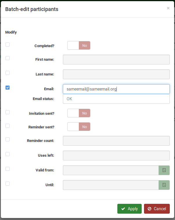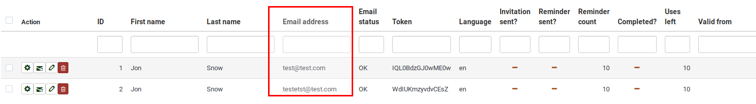 | Description | You can batch-edit also the email field from the survey participants table. Once you do this, instead of getting yyy@yyy.y, you get lskeep (see screenshots) | ||||