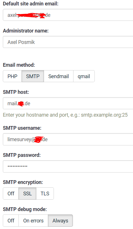 | Description | At Global Settings -> Email switching to SMTP emailing and leaving the SMTP user's password empty (which is valid) causes emails to not be sent. Limesurvey loads for a minute e.g. when creating a new admin user and trying to send him the email with login details. Afterwards there is a Warning "no email could be sent". Even though SMTP output on errors was enabled, no further details were shown. My guess is that the password is actually NOT empty because it already shows up pre-filled with "somepassword" when checking the HTML source. | ||||