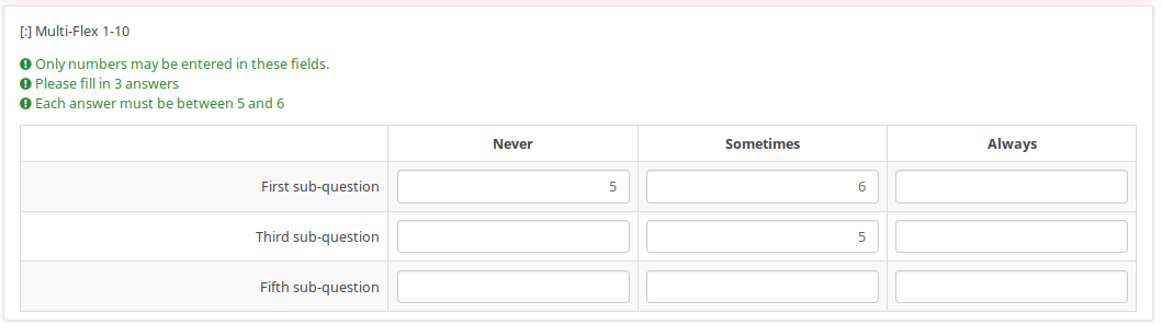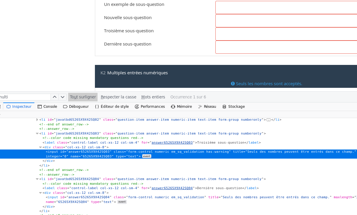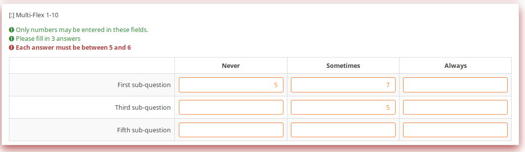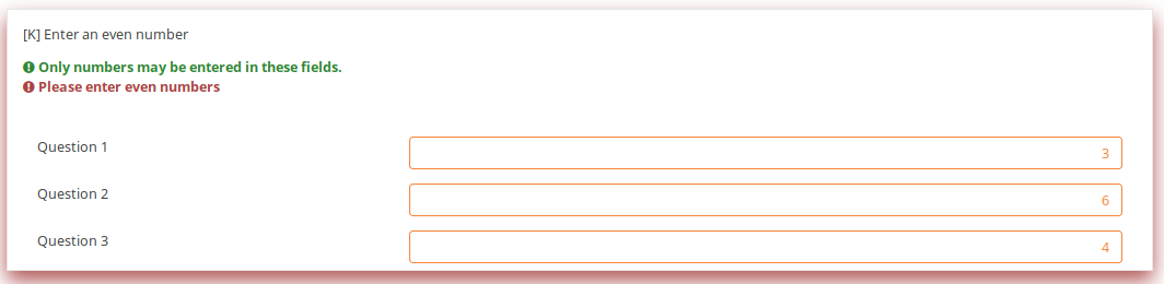 | Description | So, the first question uses a validation criteria in such way that you can type in only even numbers. If you type something wrongly, the whole question gets "marked"/surrounded by a red textbox + what you entered gets a red font. In the past, only the wrong subquestion fields were getting marked with red if the validation criteria failed. The subquestion fields To better understand what i mean, compare the screenshot attached below to this one: https://manual.limesurvey.org/images/archive/b/bf/20180821154247!Sqvalidation.jpg | ||||
