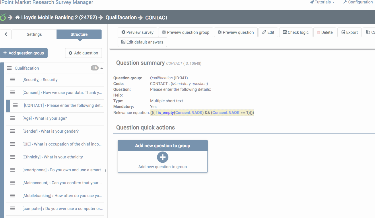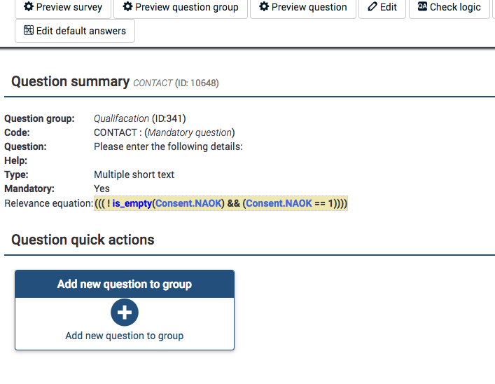 Additional info: When I try and reenter the conditions page to edit the page refuses to load. When I go to edit the question and manually edit the relevance (to delete whats there) it refuses to allow me, but when I load the conditions page there is none listed. I cannot copy and paste the relevance field to show you. So tried to copy the survey to a new one and reset conditions, when I then try and add the same condition I get the error: There is no way to add conditions - this is a Critical Error. Having to rollback. |