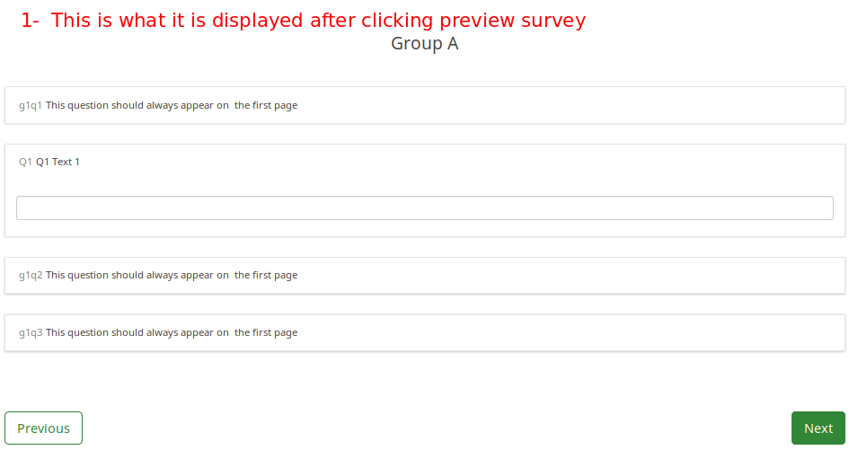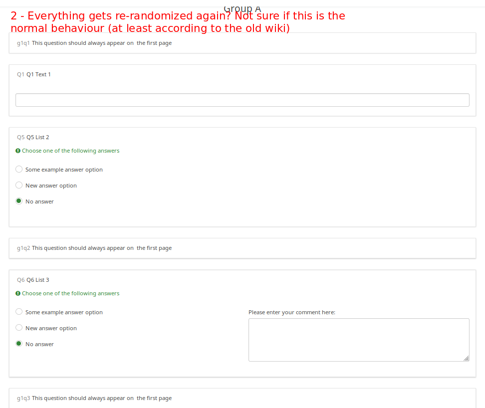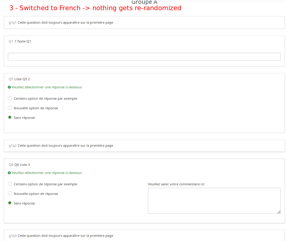 | Description | See the screenshots. Have also attached a survey example. So, the idea is the following one: when I preview the survey for the first time, the questions get re-randomised. Once the re-randomisation was done, I can change the language of the survey how many times I want... it does not get re-randomised again. The original behaviour in the past (at least according to the wiki): The survey was not getting re-randomised when swiching the language for the first time. | ||||