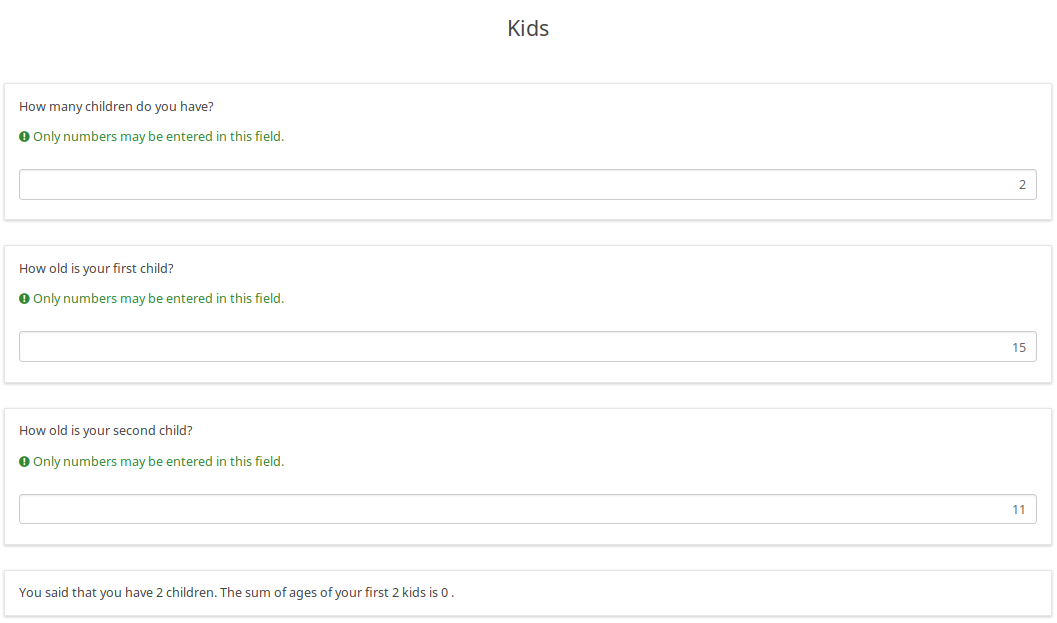 | Description | Preview the attached survey The text display does not display the sum if the questions are displayed on the same page at the same time. This issue does not exist if question by question format is used. P.s. According to the old screens from the manual, this was supposed to work: https://manual.limesurvey.org/File:Em-tailoring2-s-3kids-sum.jpg | ||||