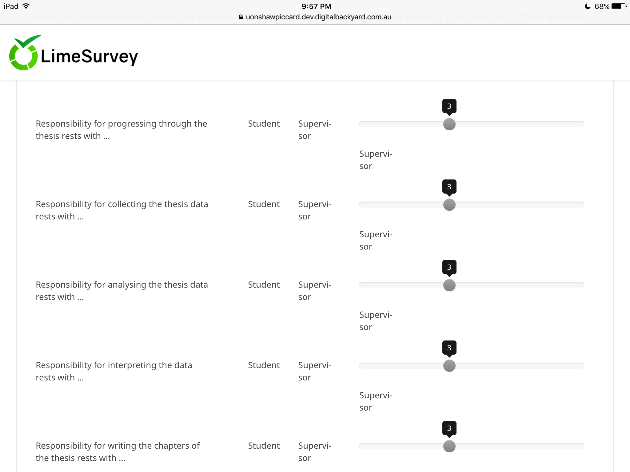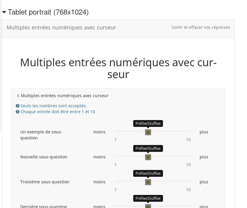 | Description | When using a Multiple Numerical Input question with the Slider layout in LimeSurvey 3.x the left/right slider labels are not rendered correctly on iPad. This issue doesn't occur when simulating the iPad resolution using a desktop web browser. The right-hand label is displayed on the left and then repeated on a new line under the slider. This issue does not occur in LimeSurvey 2.x. | ||||