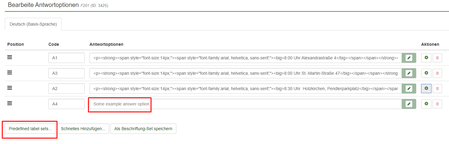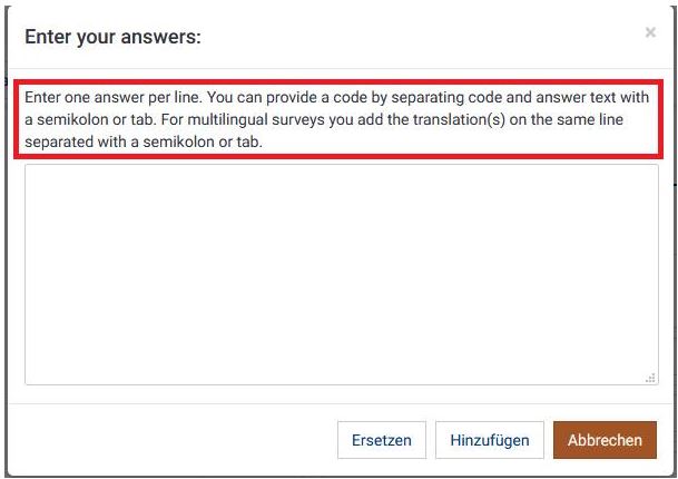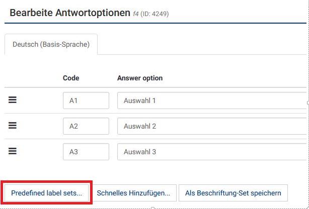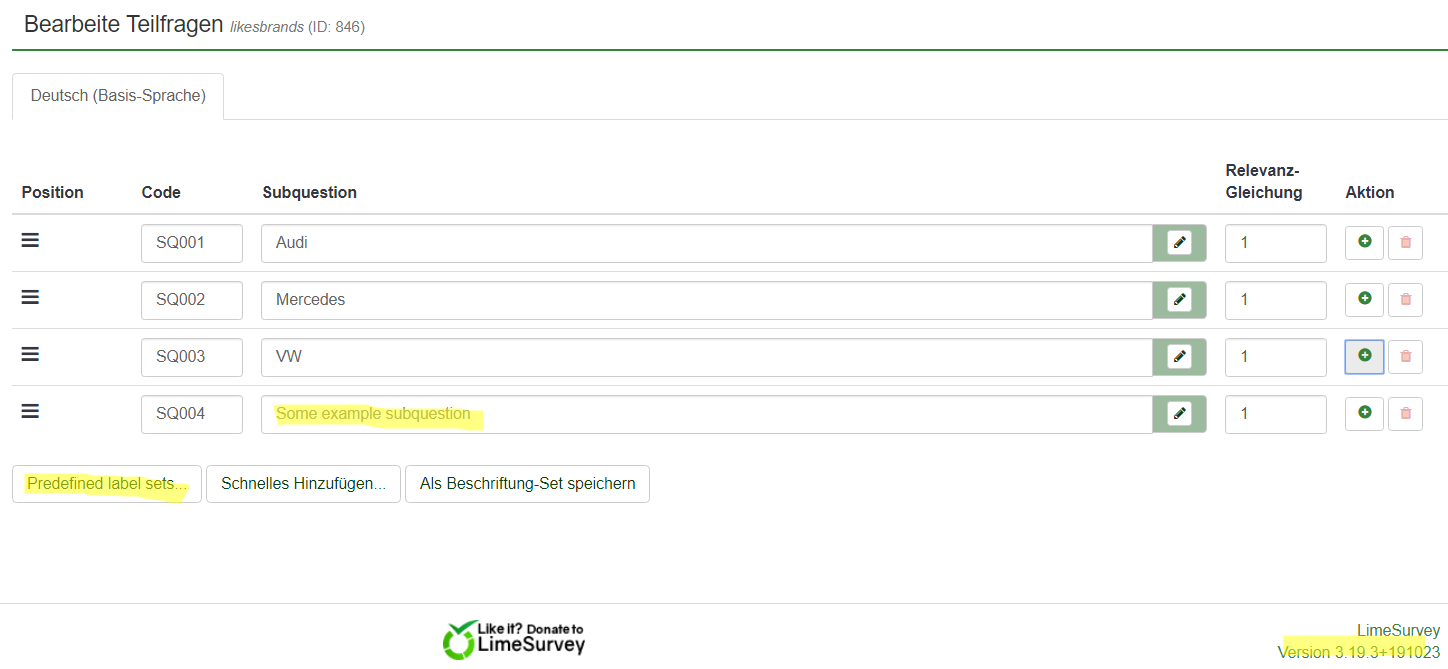 Translation of LimeSurvey 3.x.x in GermanThis file is distributed under the same license as the LimeSurvey 3.x.x package.msgid "" msgid "Predefined label sets…" msgid "Some example answer option" msgid "Subquestion" |