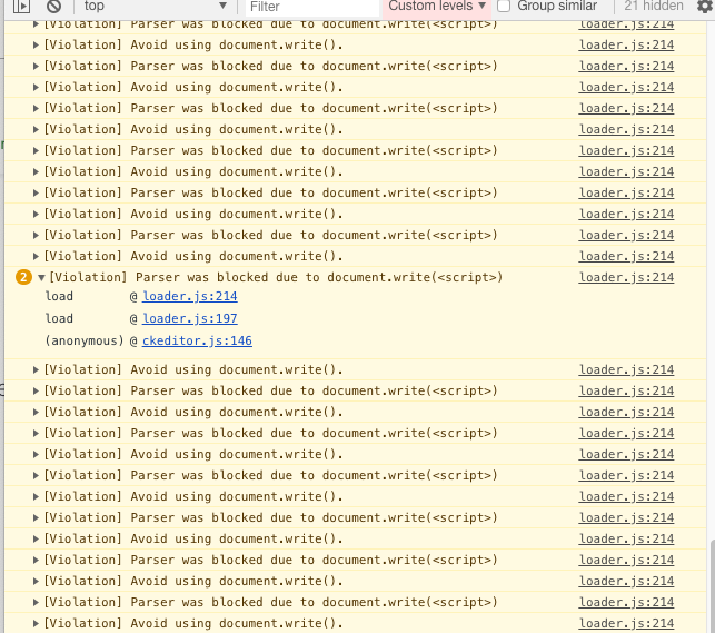 | Description | I've been tracking down various errors since moving up from LS v2 to v3 (most of which came from Cloudflare integration). The last remaining one is that the use of CKEDITOR in /core/loader.js is throwing many errors in the Developer Console in Chrome (v69.0.3497.100). This is due to CKEditor using a document.write() call. See attached screenshot. I suspect they have tightened up the blocking in this latest version of Chrome (as the errors weren't happening before the update this last weekend). Note - these errors do NOT show in Safari. The impact of these blocks is to disable editing functionality on (e.g.) question pages, etc. - this seems to be due to timeouts while loader.js loops to try and write the necessary scripts. | ||||