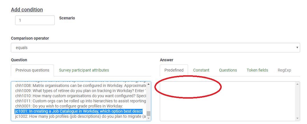 | Description | Version 3.14.9+180917 self hosted (3.14 not in list) I am creating a number of surveys and have noticed an issue with set conditions. I provide a specific example. Question jc1001 in attached survey is multi choice. I want to display question jc1003 only when jc1001 is selected as option 2. However, as you can see from screenshot, no predefined values are listed, so I can't set the condition. What I have discovered is that if I keep trying, at some random point the predefined values are shown and I can build the condition. This happened with question jc1002, which is now properly set. Is there any reason why there would be a delay before predefined values are displayed. | ||||
