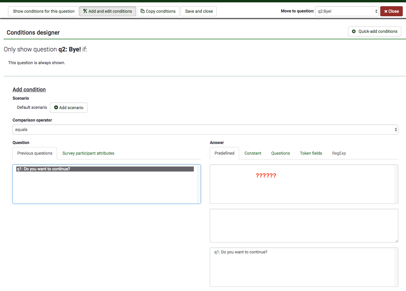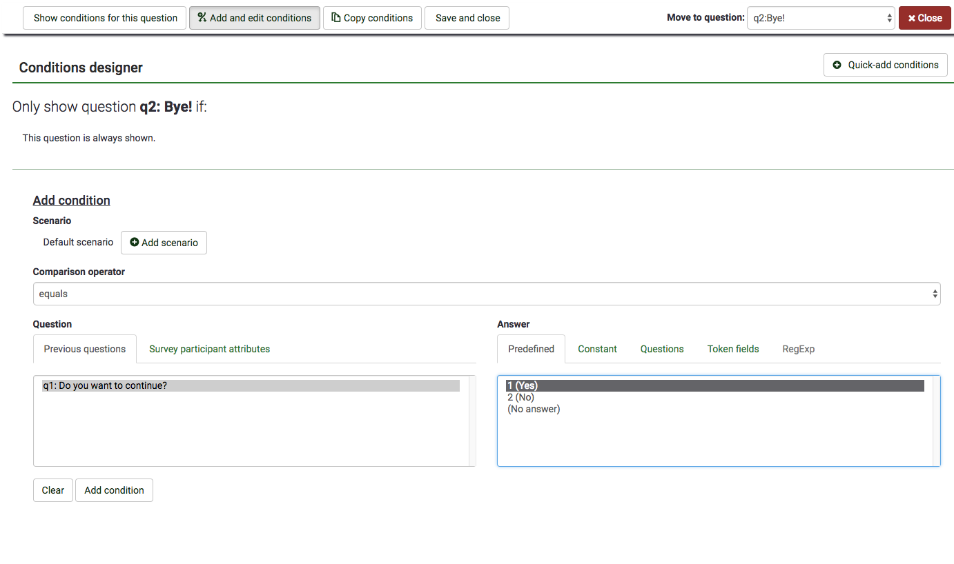 | Description | A user noticed the he/she couldn't set conditions through the "Set conditions" option. Only after refreshing the page the answers where possible to be selected. | ||||