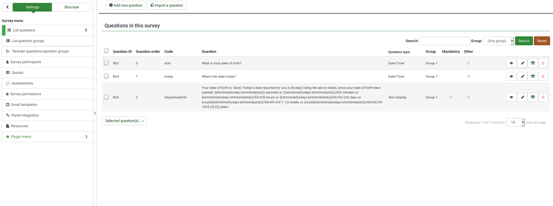 | Description | As the title suggest, once I perform certain actions in one of the two panels, the Survey settings (located under the the settings tab) disappear (see the screenshot added in the next note) Example of action that breaks the way in which the settings tab is displayed: change the number of rows to be displayed on the screen. To "fix" everything, refresh the page. | ||||