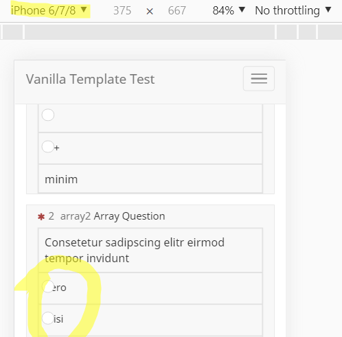 | Steps To Reproduce | Created a test survey using a core theme (vanilla) with 1 group and 1 question of type Array with 6 answers. Previewed the question in IE11, the question displays across the page. Resized the page to the point the answers start to stack. The radio button does not appear anymore. Note: this works as expected in Chrome. | ||||