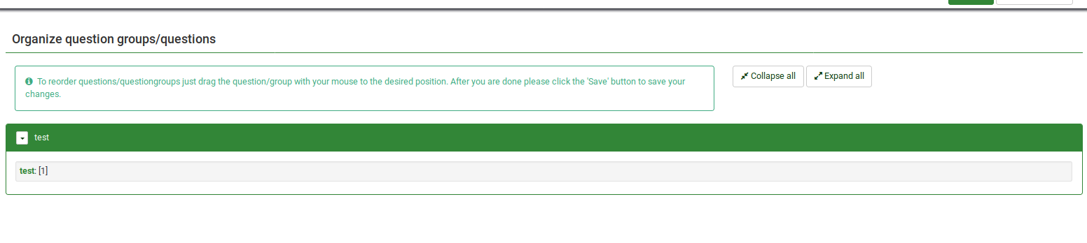 Text: To reorder questions/questiongroups, just drag the question/group with your mouse to the desired position. After you are done please click the 'Save' button to save your changes. Lil' changes are required: To reorder questions/question groups, just drag the question/question group with your mouse to the desired position. After you are done, click the 'Save' button to save your changes. | ||||