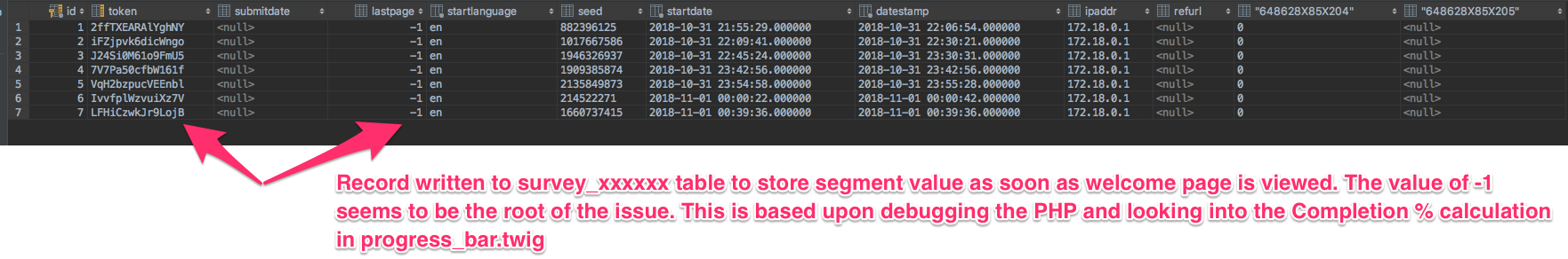 | Description | We are currently running the current version of LS. We have a survey which utilizes the Panel Integration capabilities to capture variables passed in via the query string. In our case, the parameter is named "segment" and it is mapped to a hidden question. I've attached screenshots as well as sample surveys which should allow for reproduction of the issue. 648628 utilizes the normal welcome page and 639921 attempts to shift the Welcome message to a text block within a Question Group. The issue seems to reside with the DB record written to store the Panel Integration variable which notes the "lastpage" with a value of -1. Based upon the PHP and progress_bar.twig debugging performed, the -1 causes issues with the progress calculation and the rendering of the "first page". With debug=1, there is a PHP warning displayed but it seems to occur upstream of the actual issue. Screenshots attached just in case. The issue we are encountering is the Welcome Page is not displayed correctly in situations where a participant clicks the survey link, lands on the Welcome Page, chooses not to take the survey at this time, and clicks the link later to return to complete the survey. We believe the issue is related to a record being written to the "survey_####### " table to store the query string parameter and setting the "lastpage" equal to -1. When the participant returns later, they receive a window with a negative (-200%) progress number and no welcome text. We tried dropping the Welcome Page and using text on a survey page but still continue to encounter the issue. | ||||