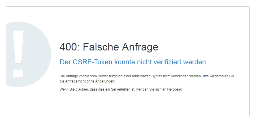 | Summary | 14269: 400: Falsche Anfrage Der CSRF-Token konnte nicht verifiziert werden. | ||||