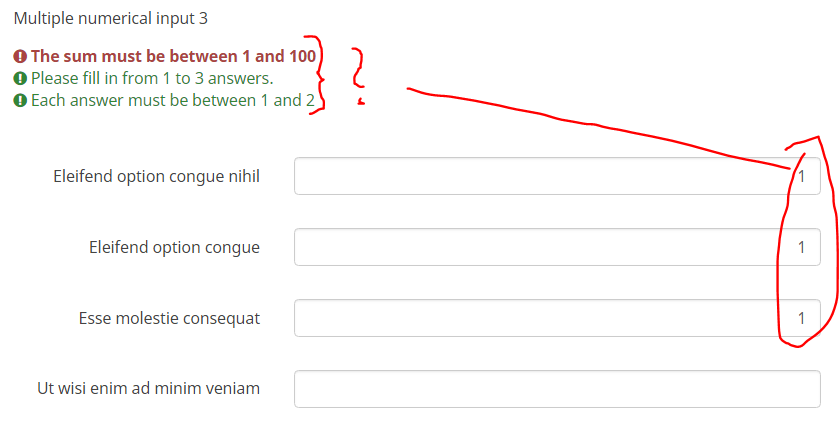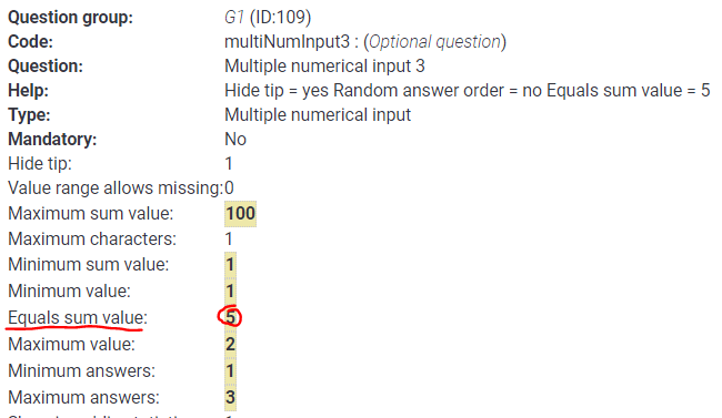 | Description | If you set a "maximum sum" value and another "equals sum" value at a multi numeric question, then the information about the equal sum value is missing which makes it impossible for the user to determine why his input is wrong. At survey runtime there is a hint that the sum may not exceed value X but there are no details listed that the sum has to be equal to value Y. | ||||