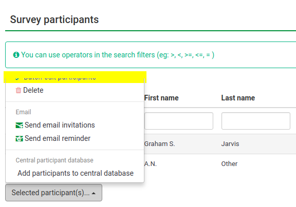 | Description | I have version: 3.15.3+181108 Hello everybody, in the survey participants screen, if I have more than one participant and I tick the box to the left of a participant and then select the "Selected Participant(s)...." drop-down box at the bottom of the screen I have the result as shown in the attached png. The top text is select-able but gives an error. I have the same issue in firefox, Chromium and Chrome (Ubuntu) This isn't a big issue - I simply wanted to report it. | ||||