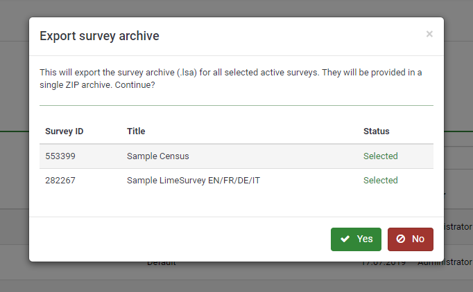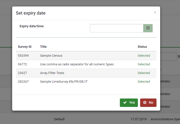 | Description | "Are you sure you want to delete all those surveys?" is not showing which surveys actually have been manually selected while we can assume the user knows which ones they selected it may be safer and better approach to list the surveys so they can double check them, especially if they may be working with a bigger list in case they have selected surveys they didn't meant to delete or change their mind (as a result of reviewing survey names) they can thus click "No" and review their choice, where otherwise having simply pressed "Yes" to confirm and only then receiving the list of surveys that have been deleted could be fatal to realise having deleted a wrong survey as it will be too late :) | ||||