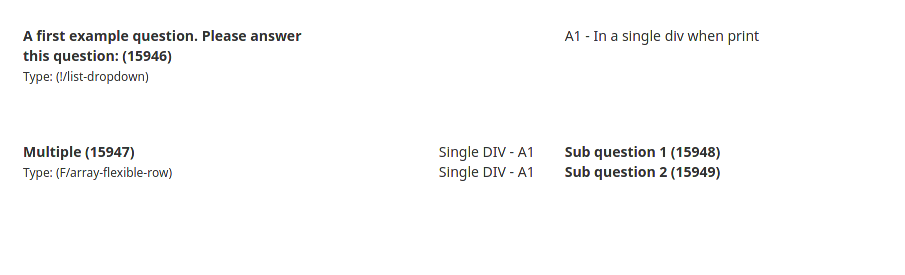 | related to | 14297 | assigned | cdorin | Feature requests | Missing setting to turn off showing answer/question codes at print answers overview |